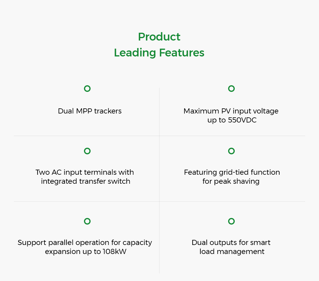 Cet onduleur hybride Py multifonction intègre un régulateur de charge solaire MppT, un onduleur sinusoïdal pur haute fréquence et un module UPS, le tout dans un seul appareil. Il est idéal pour les applications d'alimentation de secours hors réseau et d'autoconsommation. Cet onduleur peut fonctionner avec ou sans batterie. Le système complet nécessite également d'autres équipements, tels que des modules photovoltaïques, un générateur ou le réseau électrique public, pour un fonctionnement optimal. Veuillez consulter votre intégrateur système pour connaître les autres architectures possibles en fonction de vos besoins. Le module Wi-Fi/4G est un dispositif de surveillance prêt à l'emploi à installer sur l'onduleur. Grâce à lui, les utilisateurs peuvent surveiller l'état de leur système photovoltaïque depuis leur téléphone portable ou leur site web, à tout moment et en tout lieu.